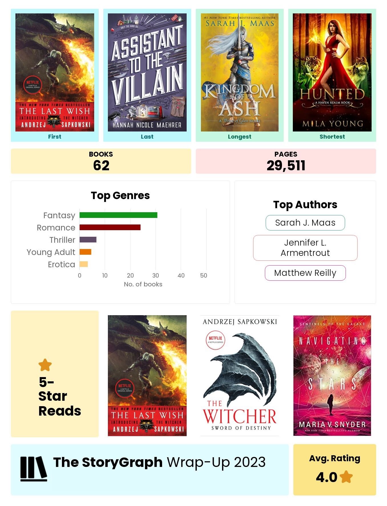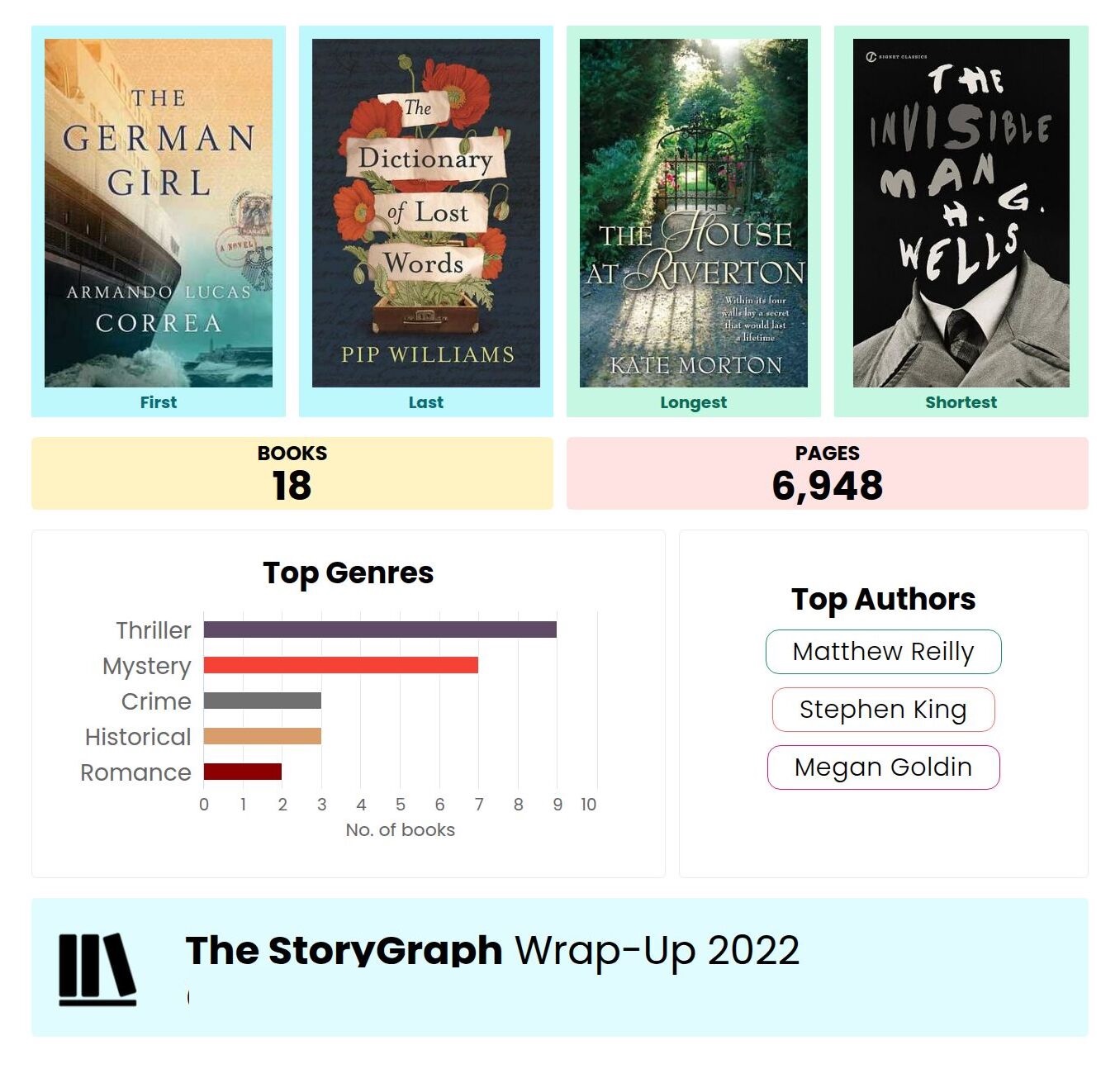 Here are my storygraph wrap ups from the last few years to give you a bit of an idea of what I tend to read: